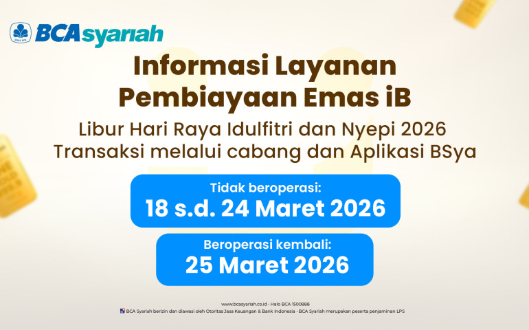 Kepada Yth. Nasabah BCA Syariah, Dalam rangka memberikan layanan terbaik kepada seluruh nasabah BCA Syariah, selama libur Hari Raya Idul Fitri...