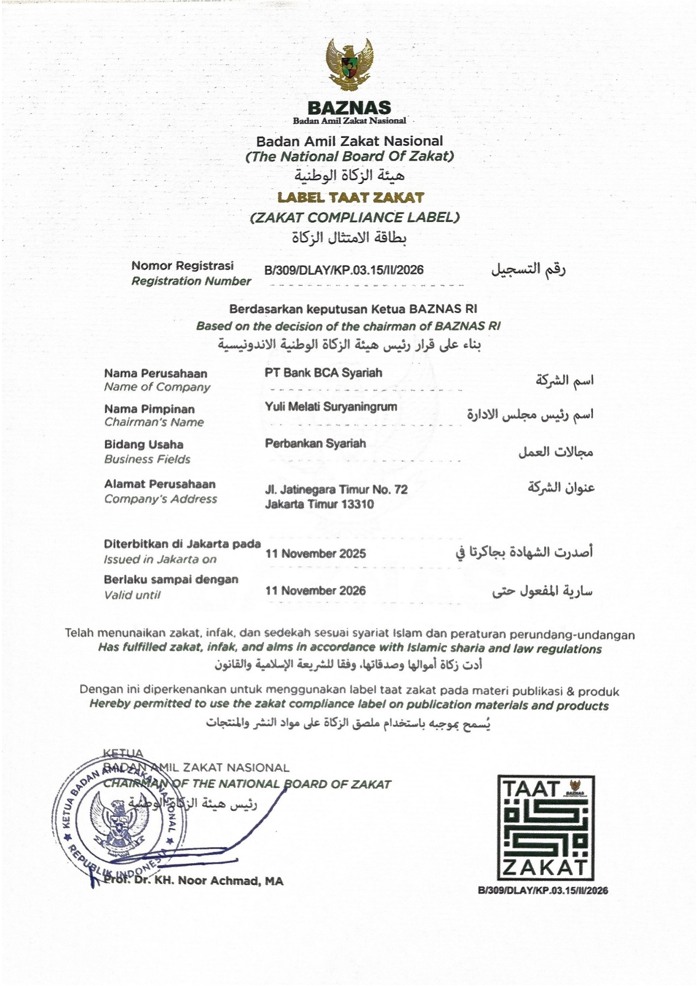 PT Bank BCA Syariah (BCA Syariah) menerima Label Taat Zakat dari Badan Amil Zakat Nasional (BAZNAS) pada Selasa, 10 Februari 2025. Penghargaan tersebut diterima oleh Kepala Satuan Kerja Hukum dan SDM, Retno Wulandari.