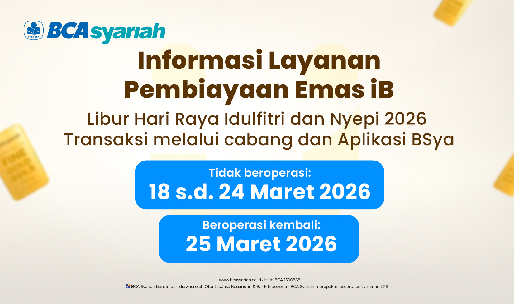 Nantikan promo dan penawaran terbaik pembiayaan emas dari BCA Syariah.