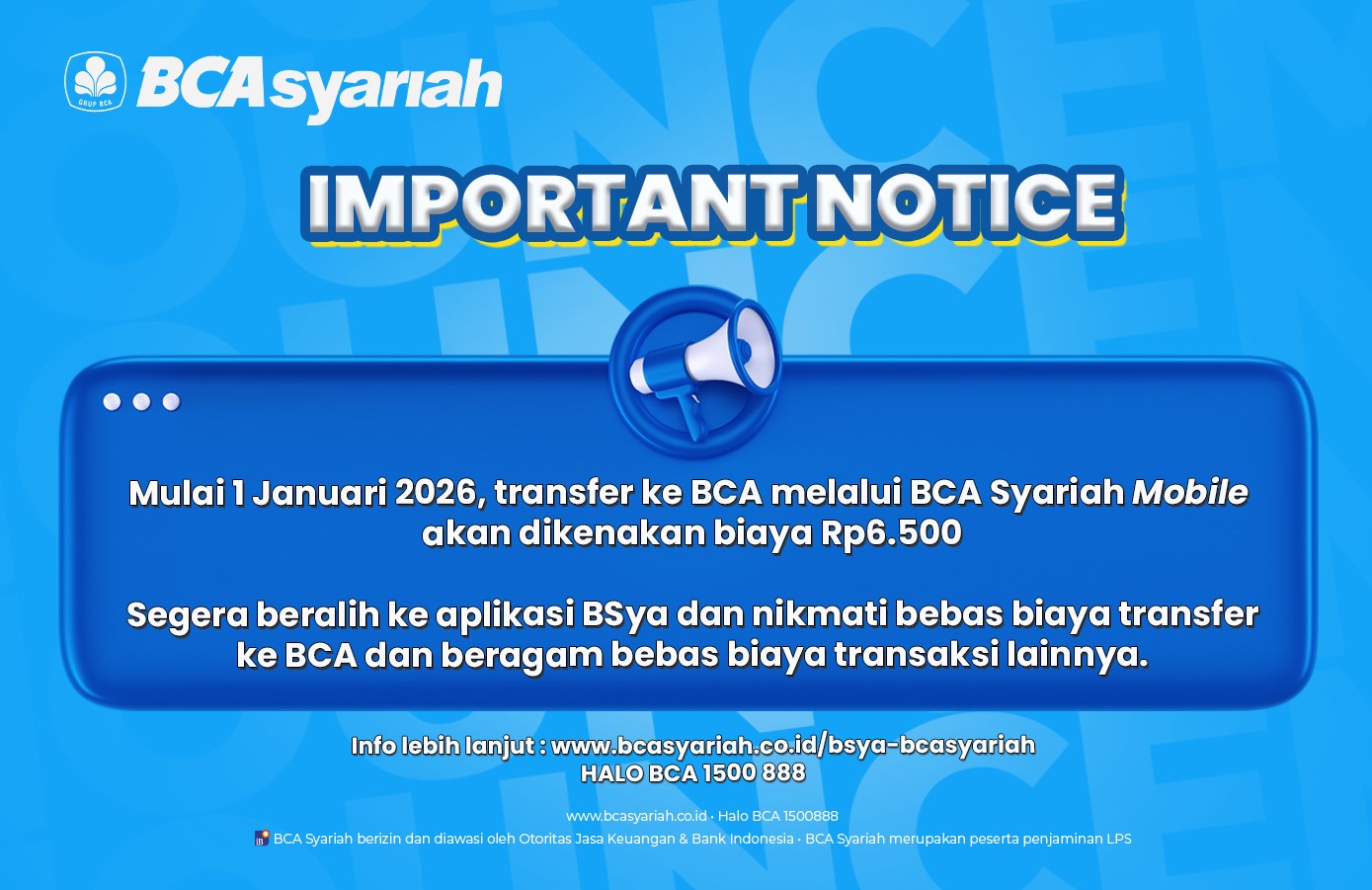 Terima kasih atas loyalitas dan kepercayaan yang diberikan kepada BCA Syariah. Untuk meningkatkan kenyamanan transaksi, mulai 1 Januari 2026, transfer ke BCA melalui BCA Syariah Mobile akan dikenakan biaya Rp6.500 per transaksi.
