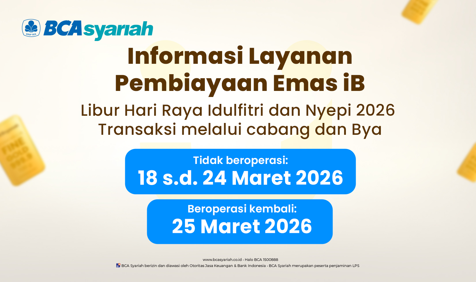 Nantikan promo dan penawaran terbaik pembiayaan emas dari BCA Syariah.