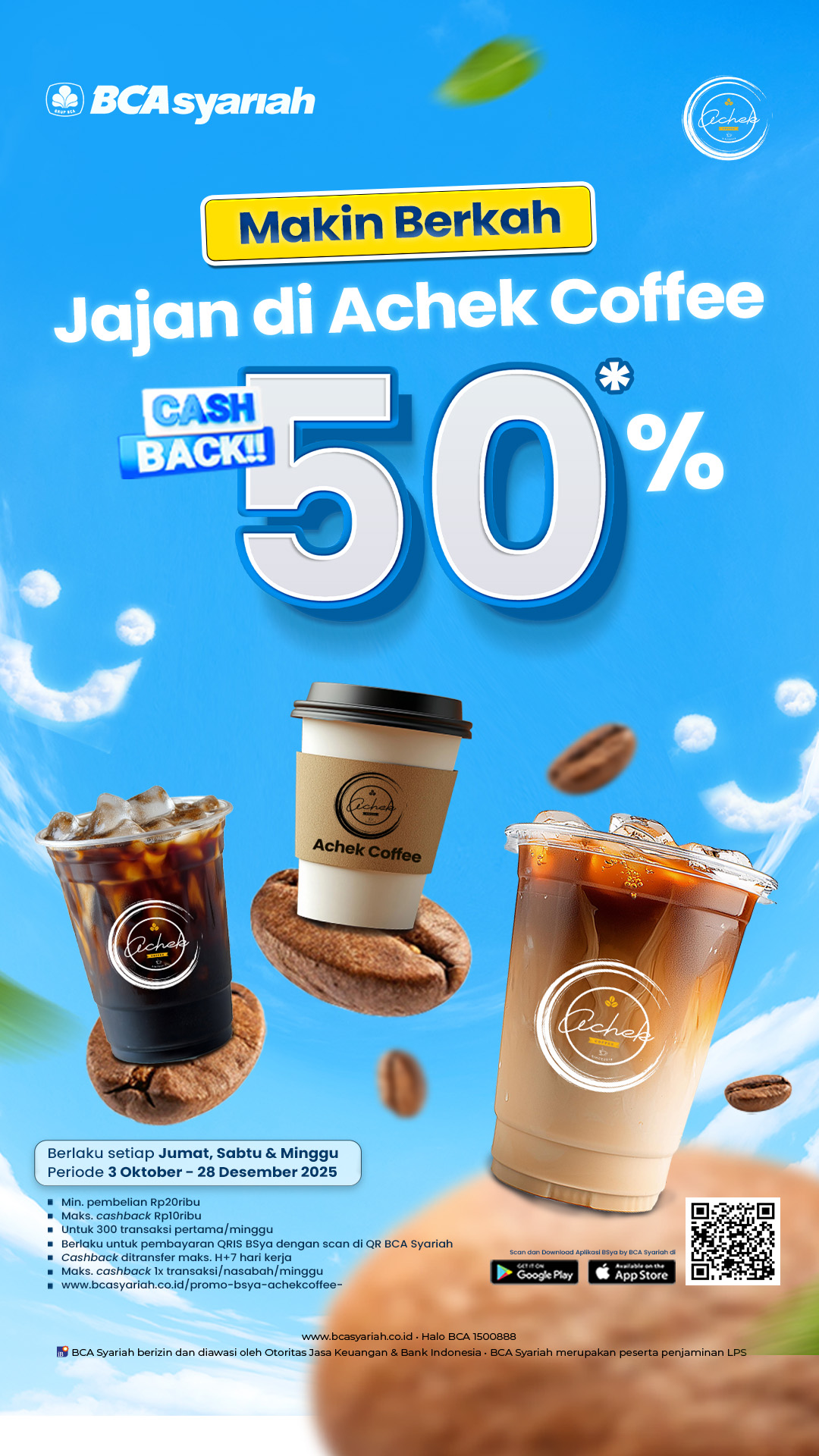 - Berlaku untuk 300 transaksi pertama per minggu di seluruh outlet Achek Coffee.
