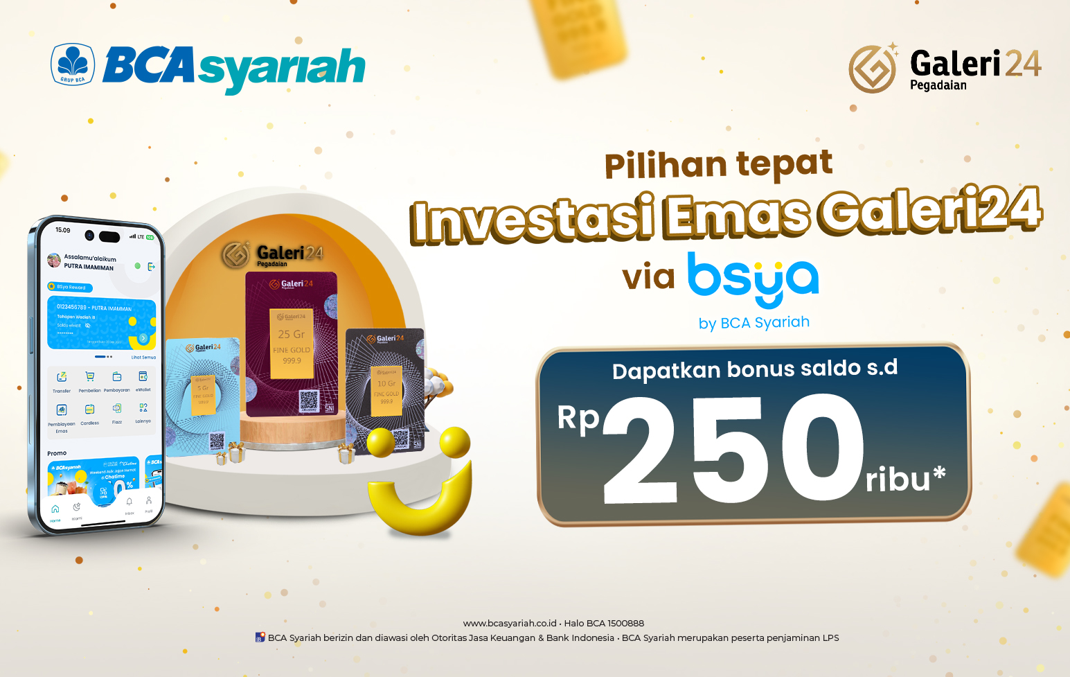 1. Promo ini hanya berlaku untuk pengajuan pembiayaan Emas pada aplikasi BSya by BCA Syariah mulai dari gramasi 5 gram